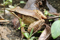 - 皮肤、体色 : 背部皮肤粗糙,有稠密的疣粒,体背后部、腹侧和后肢背部的些疣粒不具角质刺;上臂纵向肤棱较弱,略延伸至下臂;大腿和胫部背面较粗糙,具疣粒,组成几个纵向肤棱;体腹面光滑;大腿后部和肛周具扁平的大疣粒。头部和身体的背表面浅棕色至红棕色,通常具背部具脊纹;体背后部具几个黑斑;背侧褶褐色;腹侧上部分棕色,具小黑点,下部分浅棕色;肩腺黄褐色;前后肢背呈棕色,具橄榄色条纹;虹膜上1/3部分棕白色,下⅔部分红棕色;体腹面乳白色,大腿后侧具粉色和浅灰色斑块