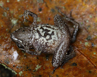 - 皮肤、体色 : 体背面皮肤光滑,整个腹面皮肤光滑无疣,股后部和肛周围具疣粒。采集到的标本具2种体背颜色类型。类型I为:头和体背黄褐色;头侧、体侧和四肢背面灰褐色,上臂和胫跗关节处深黄褐色;吻端至吻棱,及眼后经颞褶下方至肩部具黑色纹;上唇和鼓膜前具黑斑;体侧具黑色碎斑;股前具黑色云斑;前臂具黑色横纹1条,股和胫各3条;头和体侧疣粒呈灰蓝色。类型II为:背面和侧面均为浅棕色;两眼间具棕色横纹;头侧、体侧和四肢斑纹类似类型I;头和体侧疣粒灰白色。两种类似的腹面颜色基本一致,喉部和前胸部灰色,具灰黑色细斑,并有稀疏黑色斑块;腹部乳白色,具黑色云状大斑块;四肢腹面灰色,具灰黑色细斑;指、趾腹面灰黑色