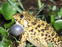 - 体长可达100mm以上;下颌前侧方有两个骨质齿状突;鼓膜明显;雄蛙声囊内壁黑色。